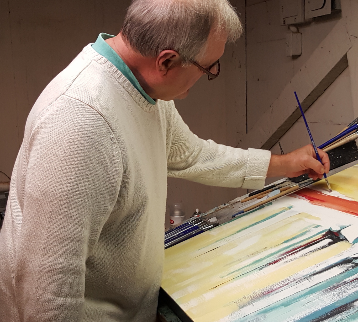 Who am I?  I was born and raised in Cedar Rapids, Iowa.  I graduated from the University of Iowa College of Pharmacy in 1973 and began practicing retail pharmacy in my home town. By the time I was in my late forties I noticed that my friends were playing too much golf, buying fast cars, taking cooking classes, or skiing in the mountains. I began to feel an urge to explore my long dormant artistic abilities. When I actually decided to pick up a brush I knew I wanted to use paint that would dry quickly, was water soluble - but not watercolors, and did  not smell. My medium of choice was, and still is, undiluted acrylic paint on paper and canvas.